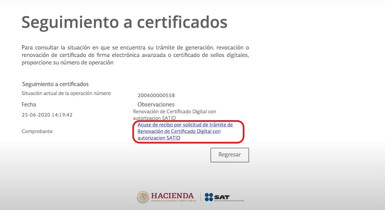 Guarda el acuse de tu trámite dando clic en "Acuse de recibo por solicitud de trámite de Renovación de Certificado Digital con autorización SATID