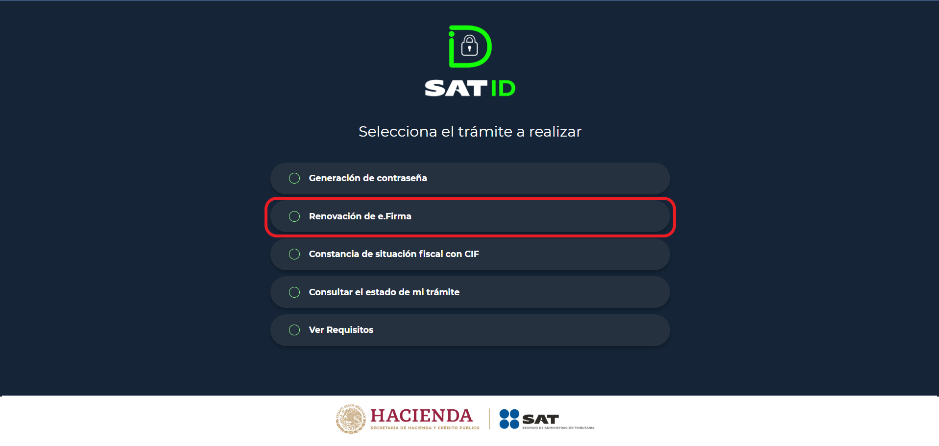 1. Ingresa a satid.com y da clic en el botón "Renovación de e.firma"
