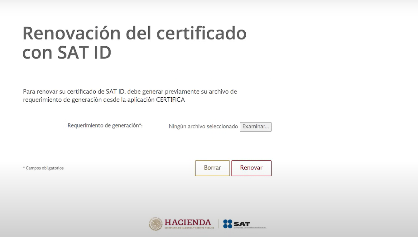 Da clic en examinar para seleccionar el archivo que generaste dentro de CertiSAT y clic en renovar